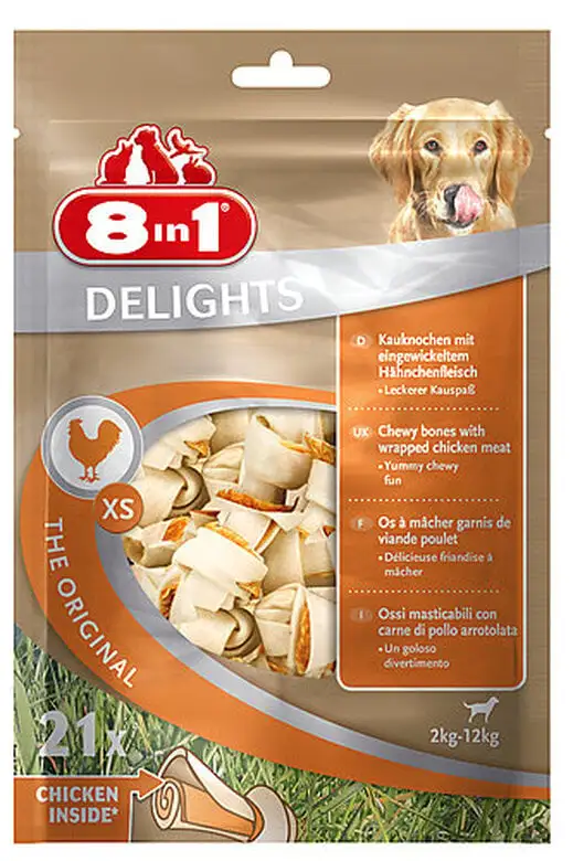 | L'avis d'Animalis | Vous souhaitez lui faire une surprise ? Vous désirez le récompenser ? Donnez-lui une friandise ! Nous vous invitons à découvrir les friandises Os à mâcher Delights XS pour chien Mini – x21 : ce sont des friandises d'une grande qualité, avec une recette spécialement pensée pour les chiens, qui lui feront plaisir. La marque 8in1 possède un ensemble de 8 valeurs : Respect, Recherche et développement, Simplicité, Assurance, Qualité, Compréhension, Expertise et Soins |