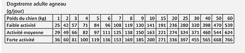 | Directives d'alimentation | Valeur énergétique 3,800kcal/kg. la nourriture doit être donnée au chien selon la dose journalière recommandée / voir le tableau d'alimentation. Ajustez le dosage en fonction de l'âge, de l'activité du chien ou de l'environnement extérieur. Évitez de trop nourrir votre animal. Servez les croquettes sèches ou humidifiées avec de l'eau chaude ou du bouillon. Veillez à ce que de l'eau douce soit toujours disponible. |