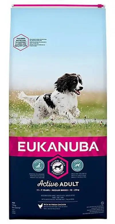 La meilleure alimentation Eukanuba pour chien adulte de race moyenne recommandée pour les chiens de taille moyenne tels que les beagles, les colleys, les cockers anglais et les teckels.